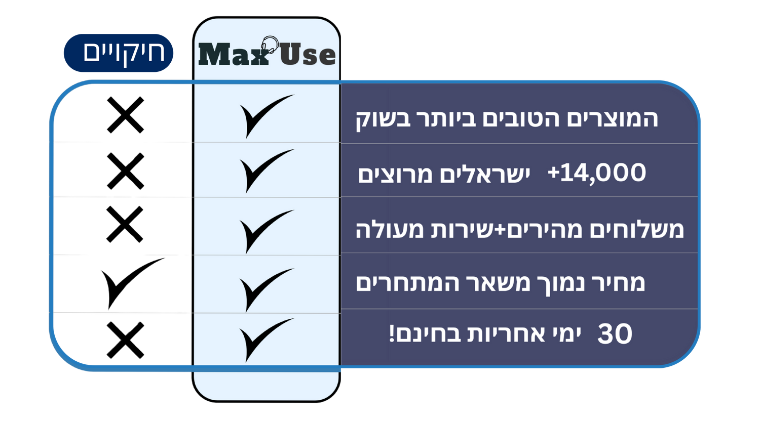 כל מוצר כולל אחריות ל־30 יום ומשלוח מהיר, ואלפי לקוחות מרוצים כבר נהנים מהבחירה בנו. עכשיו תורכם.